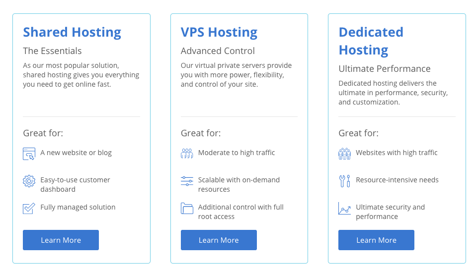 Bluehost offers everything from low cost shared hosting to dedicated servers. One thing I really like is that all plans include C-panel access to control hosting, database, email accounts, etc.. Shared hosting plans at other companies often provide more rudimentary control of your host. The specific plans include: