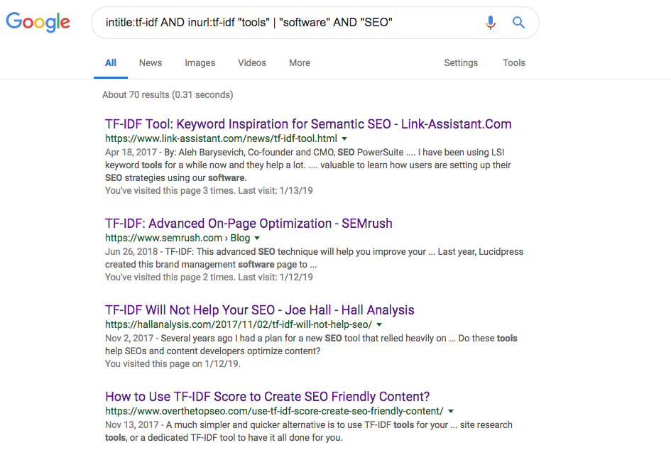 I was recently writing an article about tf-idf for SEO research and wanted to find what tools were out there and check competitive articles. I knew that a lot of the information on tf-idf was academic stuff from data scientists and wanted just tf-idf information relating to SEO. So I searched for tools or software where tf-idf was in the title and url that also had the word SEO in the page.