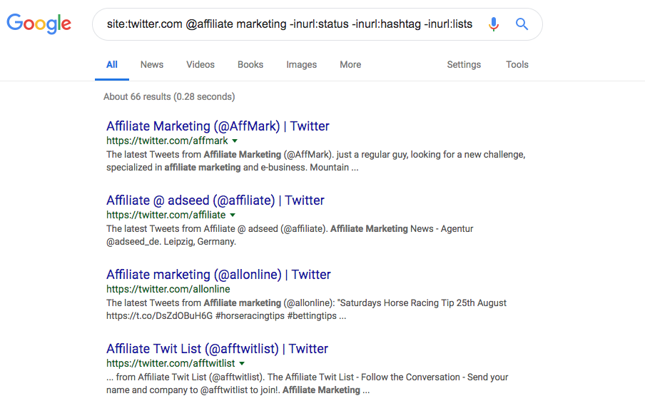 site:twitter.com @affiliate marketing -inurl:status -inurl:hashtag -inurl:lists