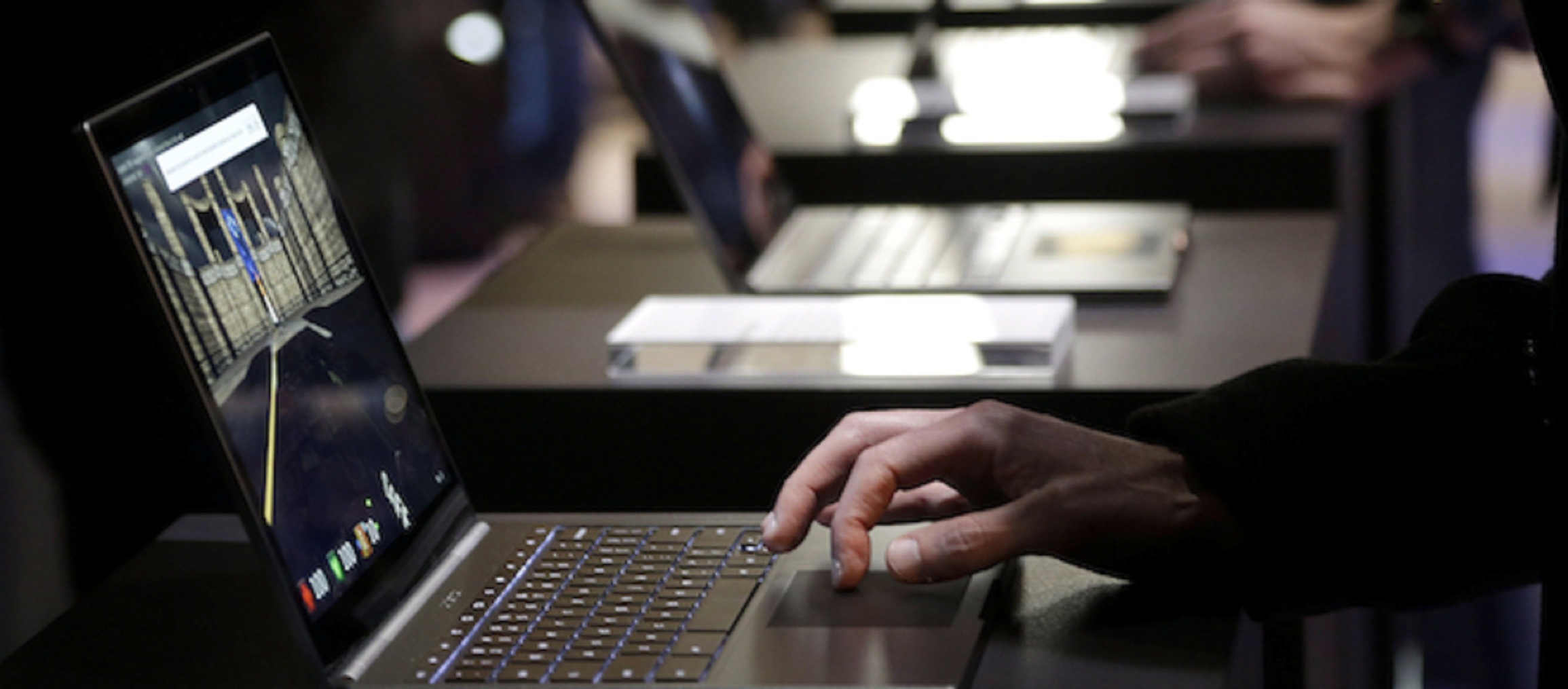 People test the the Google Chromebook Pixel laptop after an announcement in San Francisco, Thursday, Feb. 21, 2013. Google is adding a new touch to its line of Chrome laptops in an attempt to outshine personal computers running on software made by rivals Microsoft and Apple.  (AP Photo/Jeff Chiu)