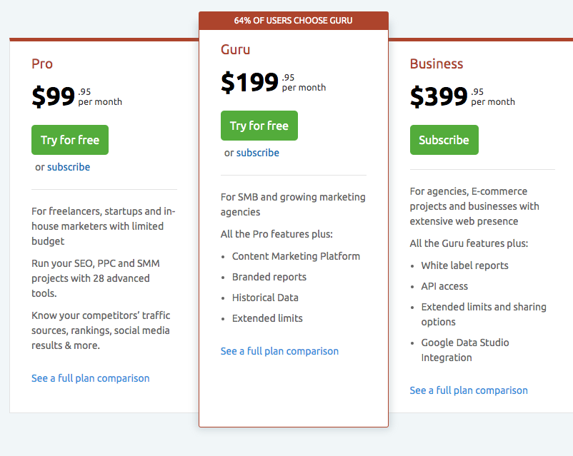 The SEMrush pricing has 3 levels starting at the Pro for $99/mo, then the Guru for $199/mo and finally the Business plan at $399/mo. There are also custom plans available for larger agencies and enterprises.