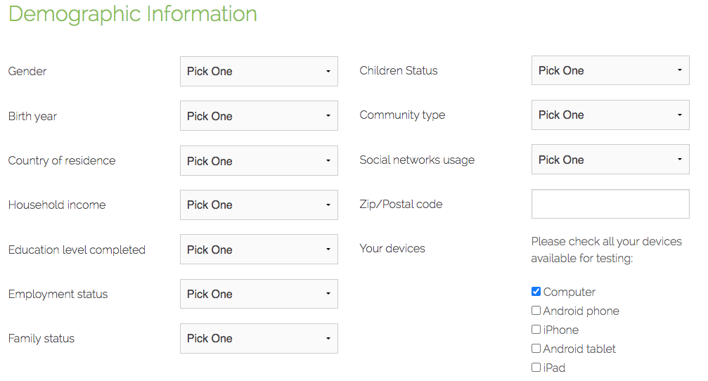 You will need to complete a demographic questionnaire that helps match you to companies running tests.