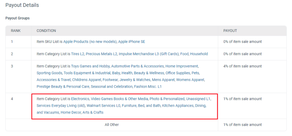 Walmart has a category based affiliate schedule from 1% to 4%. Here is the current commission structure by category: