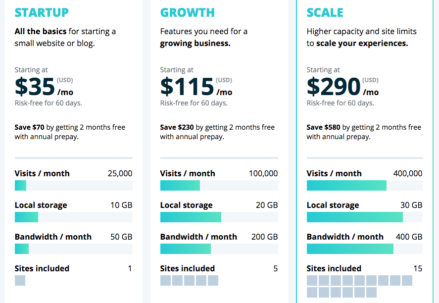 There are a few pricing plans for customers to consider. The lowest cost single host plan is $29/mo when billed annually at $350. You can elect to pay month-to-month with WP Engine. The entry monthly plan is $35. This includes up to 25,000 monthly visits.